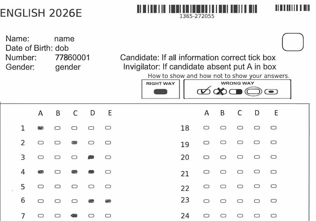 Answers are recorded on a separate answer sheet, where students fill in lozenge-shaped boxes to indicate their chosen responses (A, B, C, D, or E, or a combination where required). If a student wishes to change an answer, they must erase their original response as fully as possible before selecting a new one.